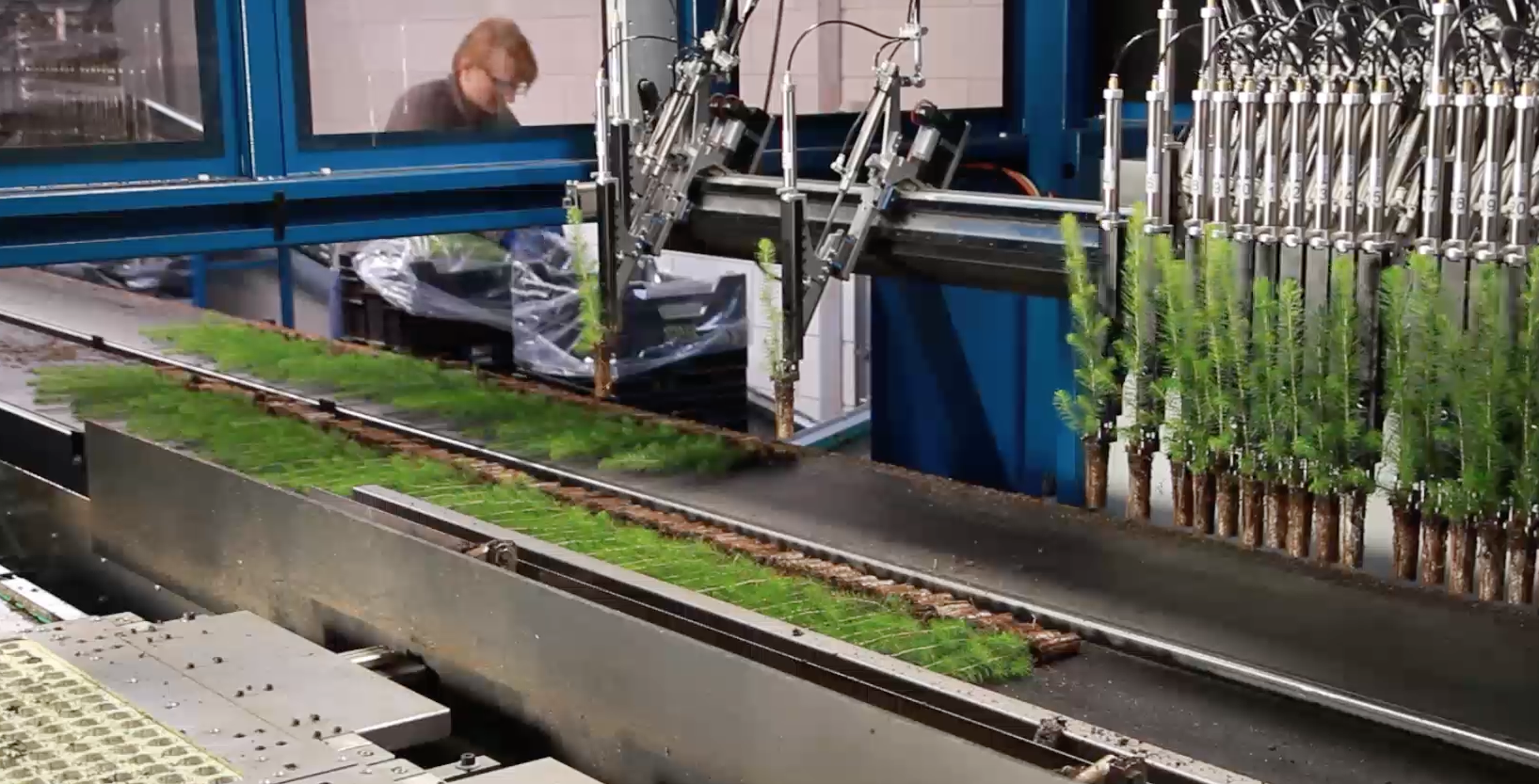 La FlexSorter Packing est une machine d'emballage à grande vitesse dotée d'un système de sélection par vision pour les jeunes plants d'arbres.